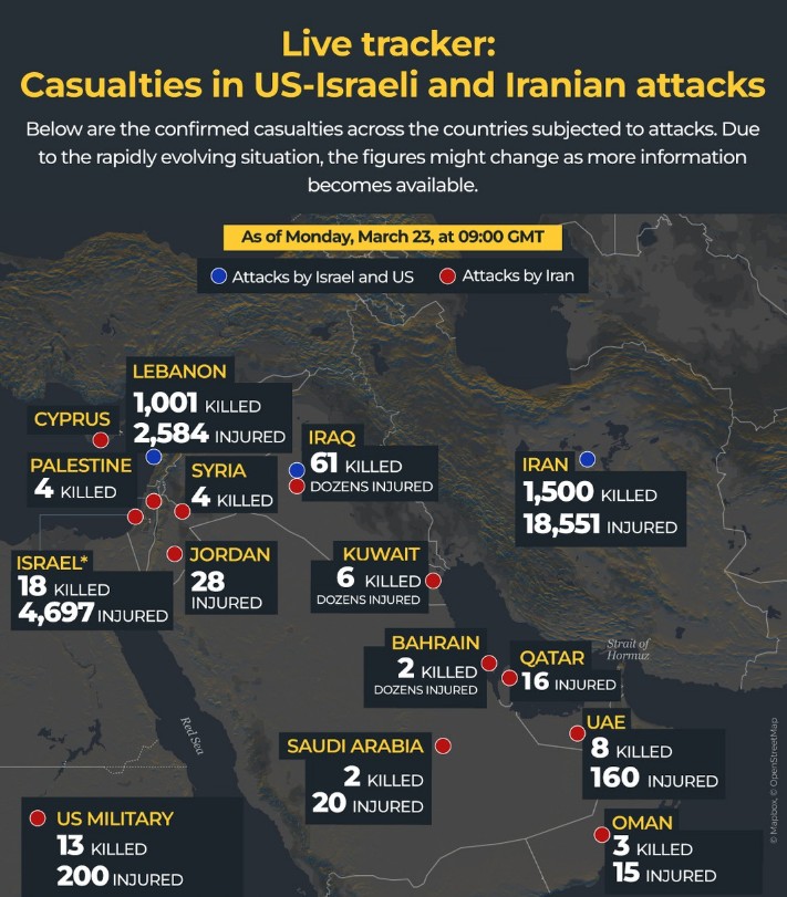 Libani: Të paktën 1,029 persona janë vrarë nga sulmet izraelite që nga 2 marsi, sipas autoriteteve libaneze. Organizata Botërore e Shëndetësisë dhe autoritetet shëndetësore libaneze thanë se më shumë se 100 prej viktimave janë fëmijë.