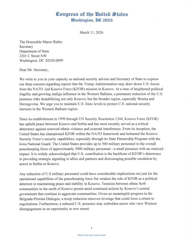 Ata po ashtu shkruajnë në letrën drejtuar Rubios se Shtetet e Bashkuara të Amerikës kanë qenë mbështetësi kryesor i KFOR-it brenda kuadrit të NATO-s dhe kanë forcuar kapacitetet e sigurisë së Forcës së Sigurisë së Kosovës, veçanërisht përmes Programit të Partneritetit Shtetëror me Gardën Kombëtare të shtetit të Iowa-s.